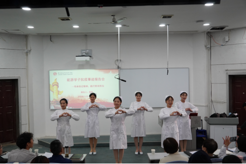 最后我院师生表演《听我说谢谢你》手语操,向娄菲护士长献上鲜花,致敬抗疫英雄。