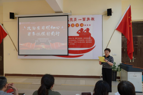 活动由护理学院党总支组织委员陈小红主持。活动开始,护理学院党总支书记王瑜为17名党员送上赠言:“一个党员的政治生命属于党,记住它是对党的忠诚和信仰,纪念它是我们每一名党员对党的感激和感谢。今天在这里举办党员‘政治生日’专题组织生活会,目的是让党员重新回忆党组织的培养历程,强化党员宗旨意识,提醒党员始终牢记入党时的铮铮誓言,激发党员的工作热情和无私奉献的精神。”