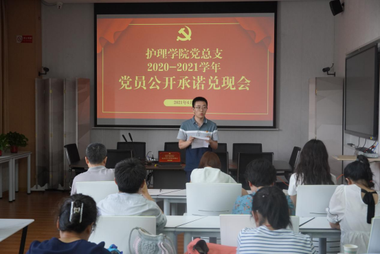 最后,党员教师为一学年前的党员公开承诺进行履职践诺总结,护理学院教工党支部教师代表俞菲、学工党支部雷东强老师公开践诺,总结一学年来党员承诺完成的情况。通过践诺活动,护理学院党员教师在坚守初心中践初心,做到言必行、诺必践,引导大家不忘初心,勇于担当,为平稳有序推进学校建设再立新功。