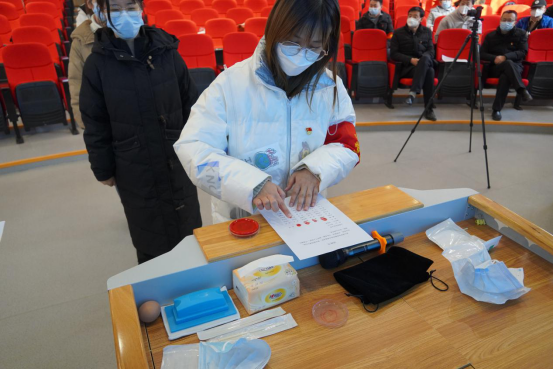 紧接着由陈小红领誓,全体志愿者共同宣誓“我自愿参加核酸检测志愿服务队,保证做到遵守纪律,听从指挥,热情服务,无私奉献,做好个人防护,严格操作流程,坚决完成任务。”铮铮誓言,回响在陕能院上空。