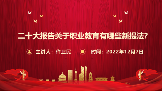 12月7日,护理学院党总支副书记、院长仵卫民在护理学院党建工作室为护理学院全体党员教师讲授党课,党课以“党的二十大报告关于职业教育有哪些新提法”为主题,结合当前职业教育发展现状进行分析并概括。