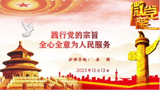 12月13日下午,护理学院党总支书记房朋在临潼校区105讲授《践行党的宗旨 全心全意为人民服务》主题党课,护理学院全体教职工及学生代表参加。