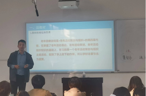 赵晨老师说课的内容是“老年团康游戏”,选自老年活动策划与组织课程,从说教材、说教法、说学法、说教学程序四部分进行说课。以学生的主动探索为主,教师引导点拨为辅,让学生分组完成老年团康游戏的案例,以游戏的形式充分调动学生的学习积极性。