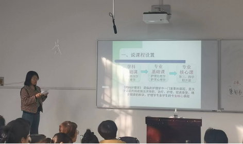 说课环节共有三位教师参与分享。傅月玥老师从说课程、说教材、说内容、说学情、说教学设计与评价、说教学特色六方面进行“内科护理学”课程说课,其中教学设计以就业为导向、以能力为本位,通过旧知回顾——新知学习——新知探索与巩固——课堂小结五个方面开展教学。