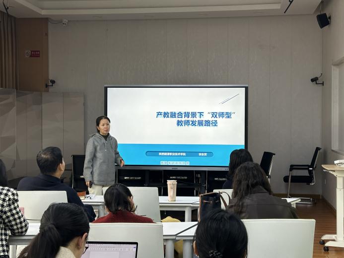 李东芳老师围绕“产教融合背景下‘双师型’教师发展路径”展开系统汇报。她结合教育家精神的内涵与新时代教师队伍建设要求,指出“双师型”教师不仅要有扎实的教学能力,更需具备企业实践经历与跨界融合素养。她提出通过“强化企业实践”“参与‘五金’建设”“提升数字化教学能力”等路径,构建“价值引领—专业精进—境界提升”的螺旋式成长通道,助力教师从“新手”走向“教育家型”教师。