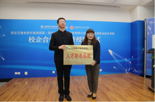 陕西能源职业技术学院科研处处长闫光准代表学校授予西安艾薇美医疗美容医院为校企合作单位,艾薇美第三片区人事总监卞鹤接牌。