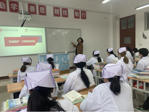 11月11日,按照学校统一安排,护理学院“订单班”宣讲会在教学楼举行。经过认真遴选,邀请到陕煤医养院、西安市碑林区第三爱心养老院两家校企合作单位来校就“校企合作订单班”进行宣讲。陕煤医养院总经理韩瑾琪、总经理助理王西雯、人力资源主管李曦、介护组长冯佳莉,西安市碑林区第三爱心养老院副院长周彩云,护理学院院长仵卫民、副院长李宏力、综合办副主任张希、班主任老师以及护理学院学生代表参加了宣讲会。