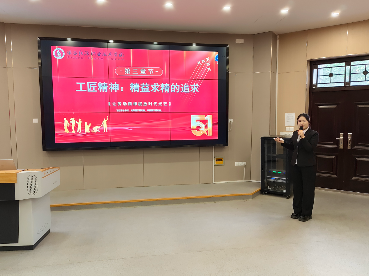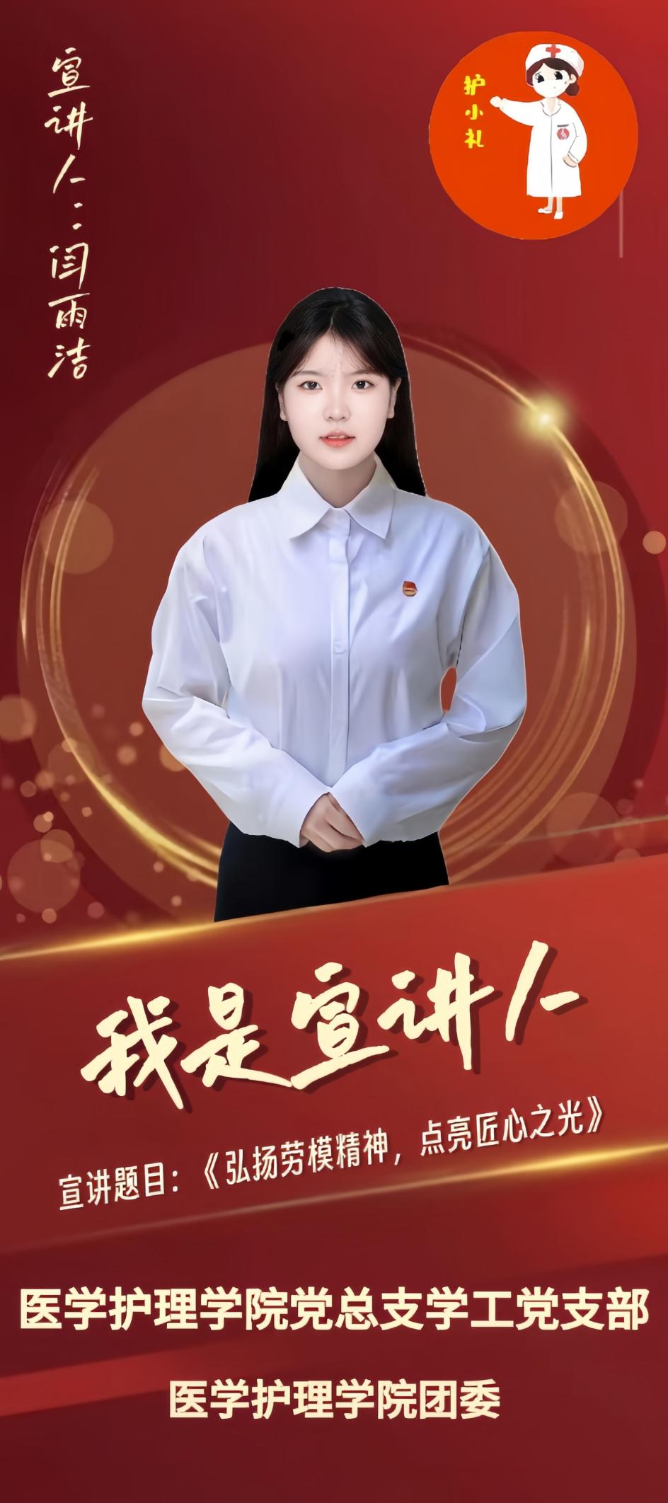 在“五一”国际劳动节到来之际,4月29日下午医学护理学院大学生“追光”宣讲团在临潼校区105教室举办了第十三期宣讲活动,本次活动主题为“弘扬劳模精神,点亮匠心之光”。医学营养2301班闫雨洁同学作为主讲人,医学护理学院辅导员以及150余名学生代表参加了本次活动。