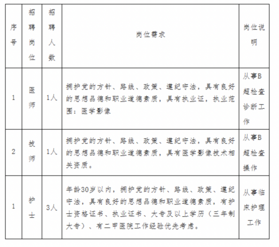现因工作需要,我院面向社会公开招聘影像医师1名、影像技师1名、护士3名,现将有关事项公告如下: