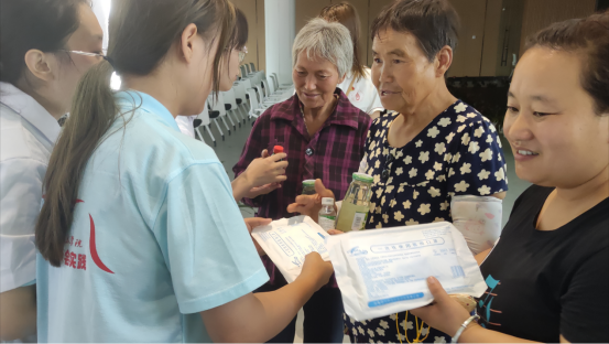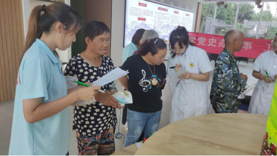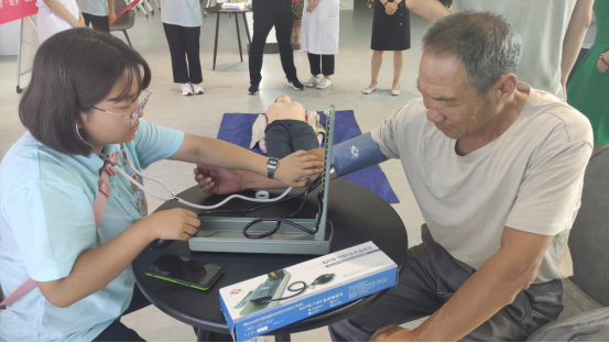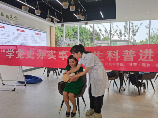签约授牌仪式后,实践队成员在园区开展开展“学党史办实事,卫生科普进乡村”暑期社会实践活动,分别为园区员工进行骨折包扎法、气道异物急救--海姆立克急救术、心脏骤停急救--心肺复苏术等卫生科普及急救知识的宣讲,与员工积极互动,现场指导实践操作,开展“乡村振兴”问卷调查,并为员工测量血压,发放卫生健康小知识宣传彩页、中药香囊及防疫防暑物品。