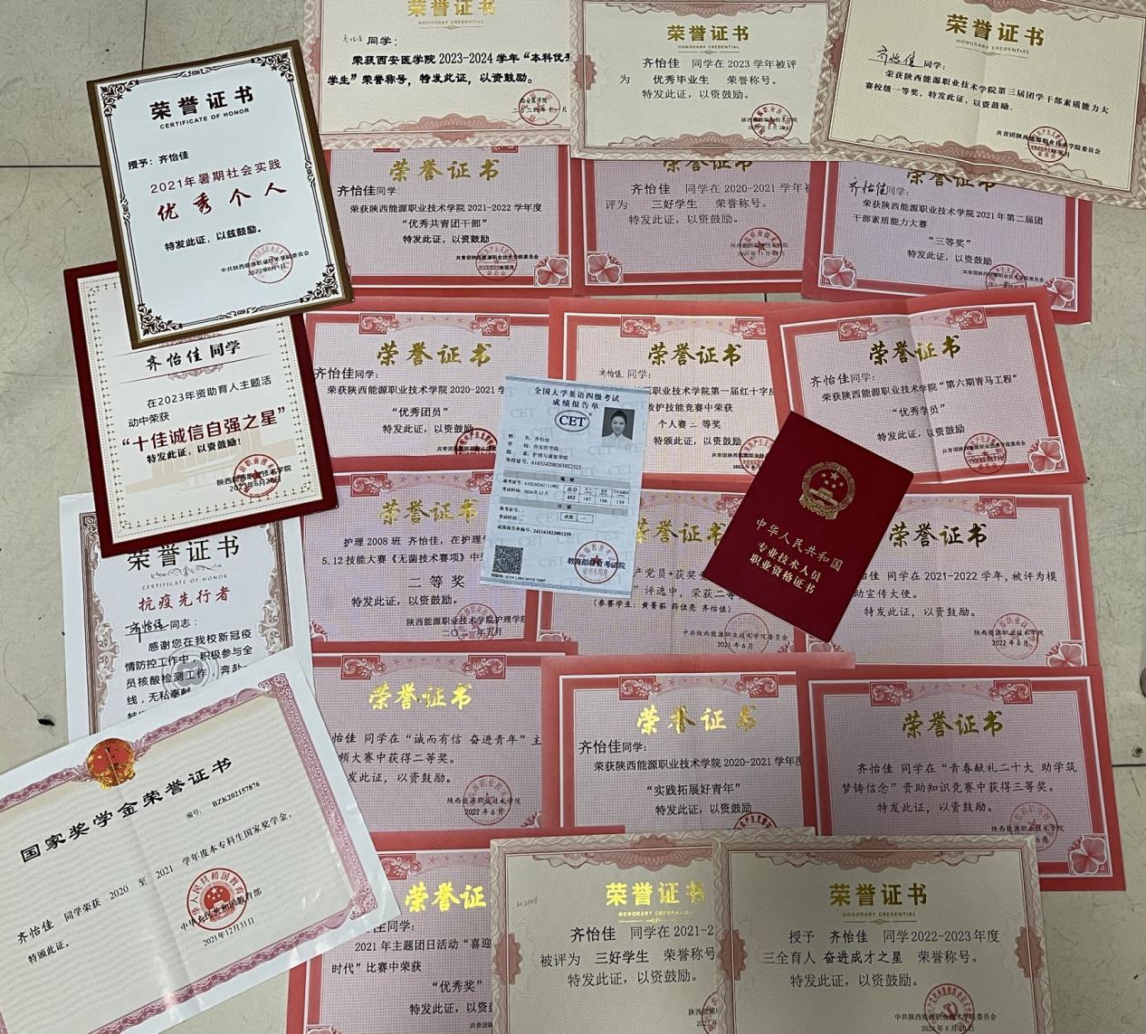 然而,命运的转折总在不经意之间。2020年,齐怡佳考上了陕西能源职业技术学院。在这里,她遇到了很多人生道路上的“伯乐”——那些倾尽全力托举她的老师们。刚刚入学的她,在陕能院的校园里也曾满是迷茫。辅导员老师们敏锐察觉到这个女孩眼底的不安。他们主动邀约齐怡佳谈心。以自身的经历告诉她“迷茫是成长的必修课,重要的是永远别停下向前的脚步。”专业课老师也以自身专业的知识暖心而有力量的鞭策这她。在老师们的不断指导与帮助下,她逐渐树立目标,连续两年学业成绩和综合素质能力测评位列年级第一,获得了国家奖学金,此外,她积极参加各项比赛,均取得不错的成绩。三年来,学校提供的探索专业领域以外知识的平台与机会、学校系统的医学教育和扎实的实践训练以及各位老师们耐心细致的培养与教育,都使她的知识水平、眼界和能力发生了质的飞跃,亦然成了她通往本科梦想这关键一跃中至关重要的成长平台与坚实跳板。带着这三年的沉淀,每天长达15个小时的学习,背了又背的书,做了又做的题,使她最终叩响了西安医学院的大门。