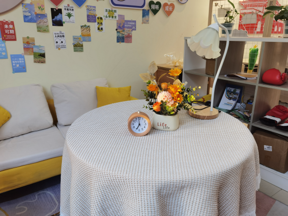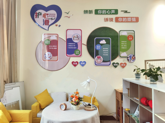 “护心港”心理辅导站以“服务学生,方便学生,普惠学生”为中心,将站点设置在护理学院党建工作室内,便于学生寻找和预约,心理辅导工作场地约100m3,面积充裕,设施齐全,窗户配备窗帘,给来访者一定的安全感。