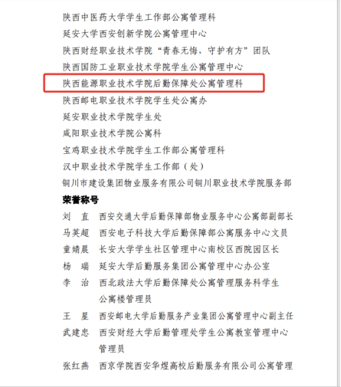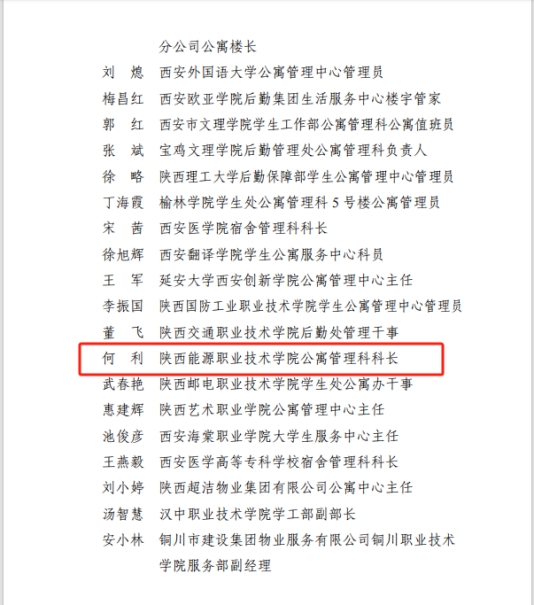 12月31日,我校公寓管理团队在陕西省教育后勤协会学生公寓管理专业委员会“2024年度最美公寓人”评选中脱颖而出,获荣誉团队,公寓管理科何利同志荣获“2024年度最美公寓人”称号。这一荣誉是对我校公寓管理团队辛勤付出的肯定,是该团队致力于为学生创造温馨、安全住宿环境的赞誉。