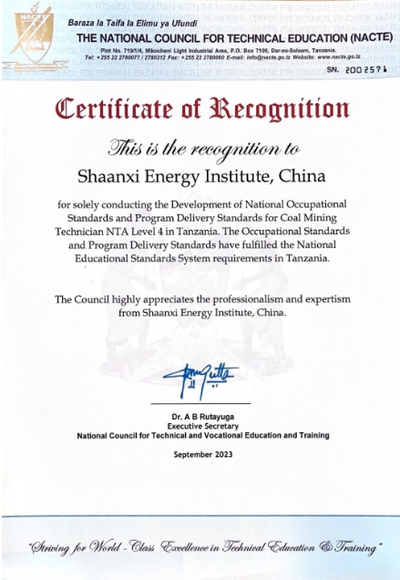 近日,由我校研制的坦桑尼亚煤矿开采技术员NTA4级国家职业标准以及配套专业教学标准顺利通过坦桑尼亚国家职业教育委员会审核,获得该国教育部官方认证,正式纳入坦桑尼亚职业教育体系并推广使用。