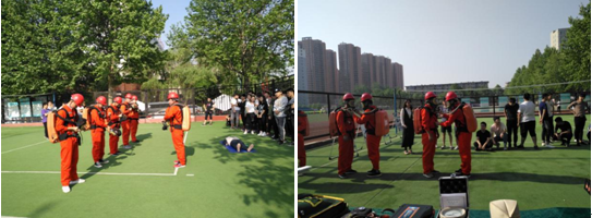 最后,演练小队成员与现场学生积极互动,指导学生应用模拟人进行心肺复苏和伤员止血包扎处理,指导学生学习氧气呼吸器、红外测距仪的正确使用,学习一氧化碳的检测和现场风速测定。