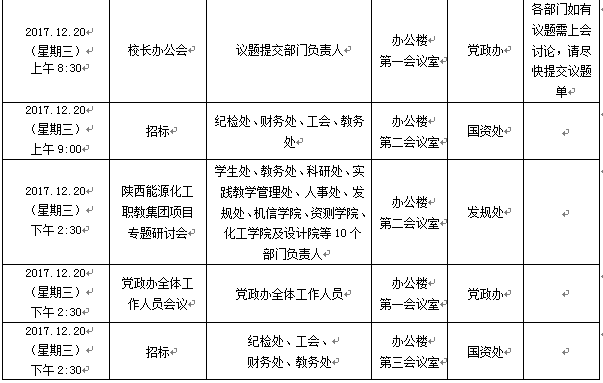 2017年12月18日至12月22日(第17周)会议安排预通知