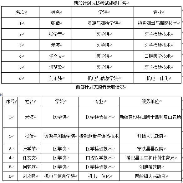 根据省西部计划项目办的相关要求,按照公正、公平、公开、择优原则,我校进行了西部计划志愿者的招募与选拔工作,经公开招募、自愿报名、组织选拔等环节筛选,今年共有6名同学参加2018年西部计划志愿者选拔考试,现对成绩排名及录取情况予以公示: