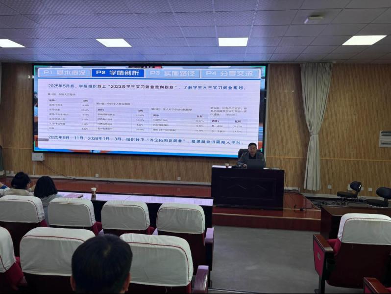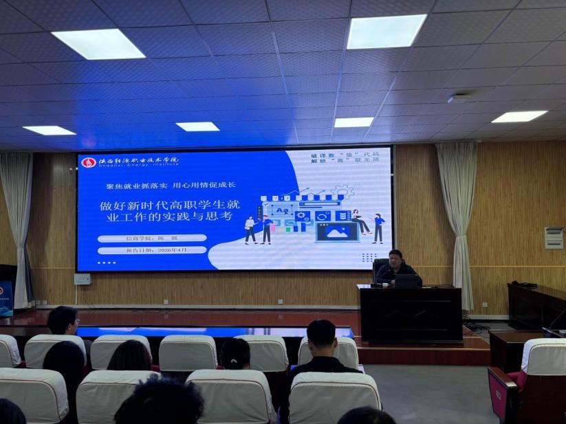陈强在分享中系统介绍了学院在毕业生就业工作中的创新举措、实践成效及下一步工作规划。他介绍了学院就业工作基本情况,为拓宽就业渠道,开展“带生寻岗行动”,组织学生赴西安电子科技大学、西安交通大学等招聘会现场对接岗位;通过学院官网、微信公众号等多渠道及时推送招聘信息,搭建多元化就业对接平台,就业工作取得阶段性扎实成效。围绕“做好新时代高职学生就业工作的实践与思考”介绍了学院构建的“党政同责、制度先行、全员参与、思想引领”工作体系,以及“总支统筹—学工牵头—专业协同—班级落实”四级责任体系,强调将就业工作与教学、科研、学生管理同部署、同落实、同考核。