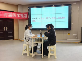 比赛现场,身着白大褂的参赛选手化身“基层医师”,与“标准化病人”展开专业互动。他们围绕主诉层层追问,精准捕捉既往病史、症状特点等关键信息,运用全科临床思维快速梳理病情脉络,同时兼顾基层患者的认知特点,用通俗语言解释病情、缓解焦虑。其中,“锐诊四方队”在继发性肺结核病例问诊中表现尤为突出,选手们不仅精准识别咳嗽、盗汗等典型症状,还针对患者担忧的传染问题进行耐心科普,主动提供心理疏导,将专业诊疗与人文关怀有机结合,充分展现了定向医学生的职业素养,赢得评委一致认可。各参赛队伍沉着应对、分工协作,展现出扎实的医学功底和良好的临场应变能力,赛场不时响起阵阵掌声。