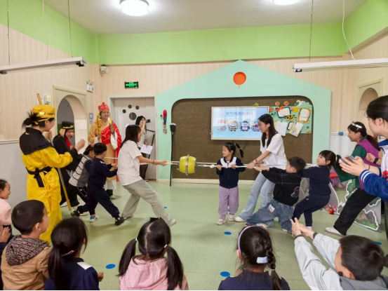 教师韩剑、段春宇及七名婴幼儿托育服务与管理专业学生走进校企合作单位——西咸秦汉阳光幼儿园,以“趣享西游 童心探秘”为主题,将经典名著《西游记》的冒险情节与空气力学原理相结合,为孩子们开启了一段充满惊喜的科学探索之旅。活动中,学生们化身唐僧、孙悟空、猪八戒、沙和尚,将取经路上“搬不开的巨石”“吹不散的乌云”“过不去的河流”三大难题,设计成三个关于空气力量的科学关卡。整场活动剧情紧凑,互动频繁。“师徒四人”语言诙谐、表演生动,深深吸引了在场的每一位小朋友。孩子们时而为“八戒”的憨态捧腹大笑,时而为“悟空”的“神通”鼓掌欢呼,在欢声笑语中理解了“空气有力量、能流动、能托住东西”的核心概念。