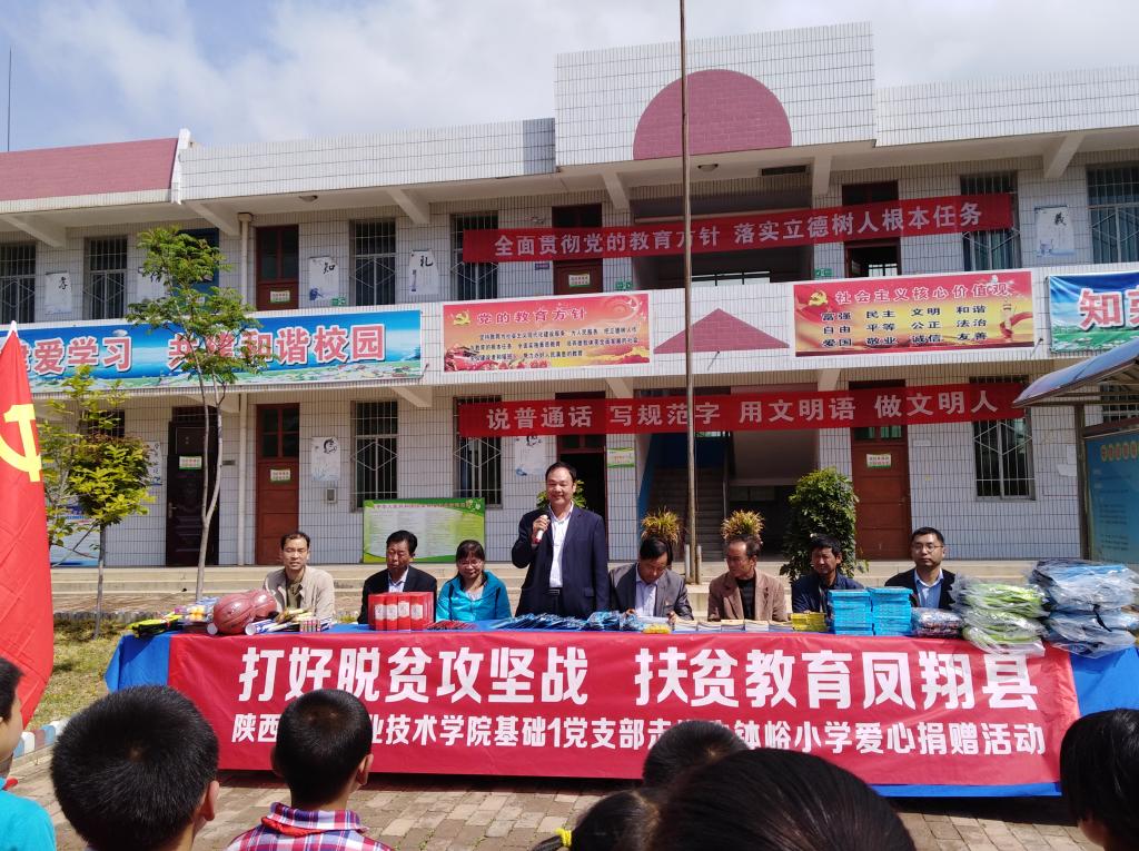 21日上午,基础1部所有党员驱车3个小时,来到了陕西省凤翔县董家河乡牛钵峪村小学。在活动现场,牛钵峪村的村支书、学校的教导主任及基础1党支部书记郭群虎同志分别作了讲话,学校全部23名学生唱“少先队队歌”表示欢迎和感谢。随后,基础1党支部所有党员给每一位学生发放了书包、文具等学习用品,为学校所有8名坚守在乡村一线的教育工作者发放了水杯,为学校捐赠了篮球、乒乓球、羽毛球、跳绳等体育用品。同时,学生代表发言表示感谢并承诺要努力学习成为国家栋梁。