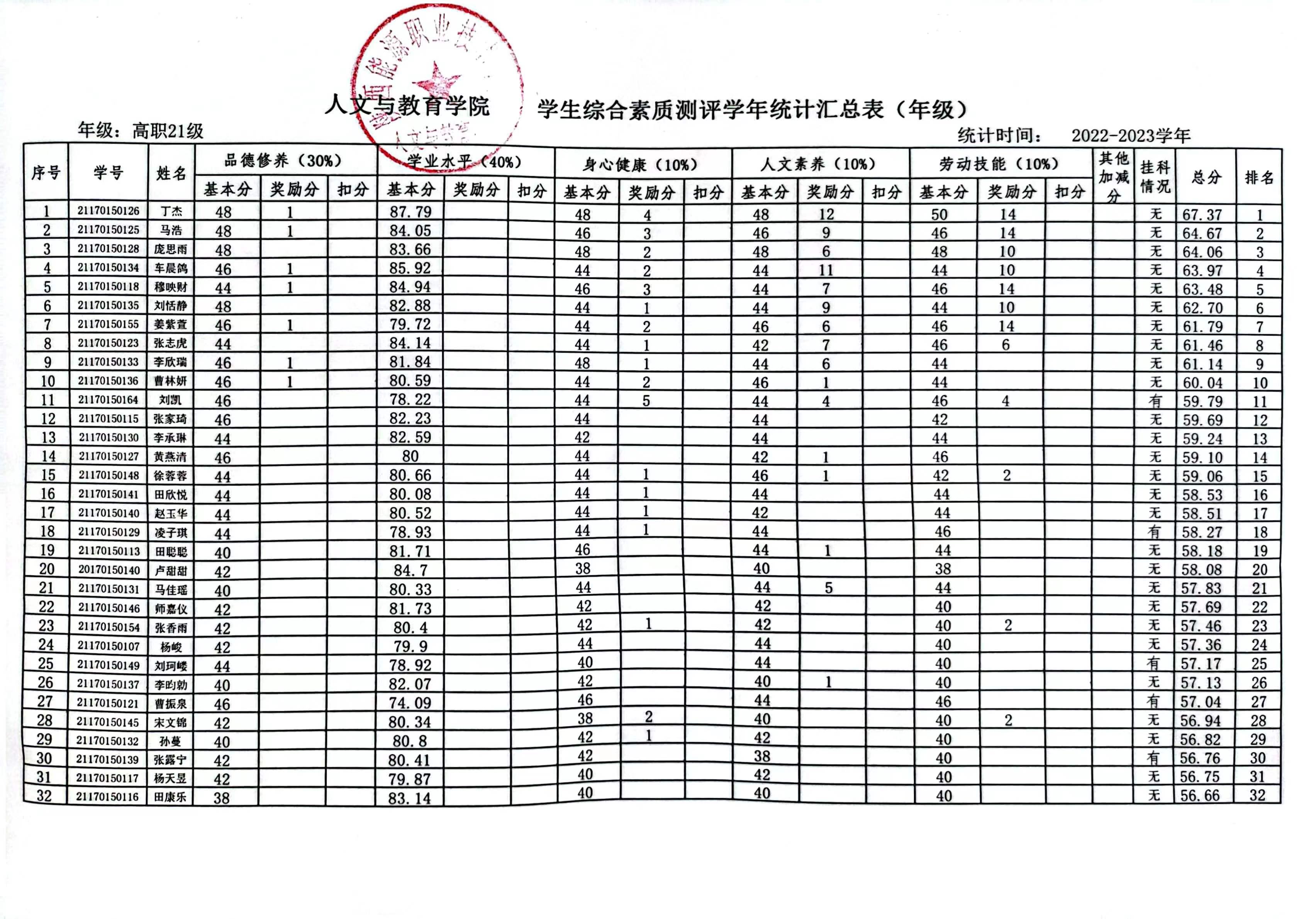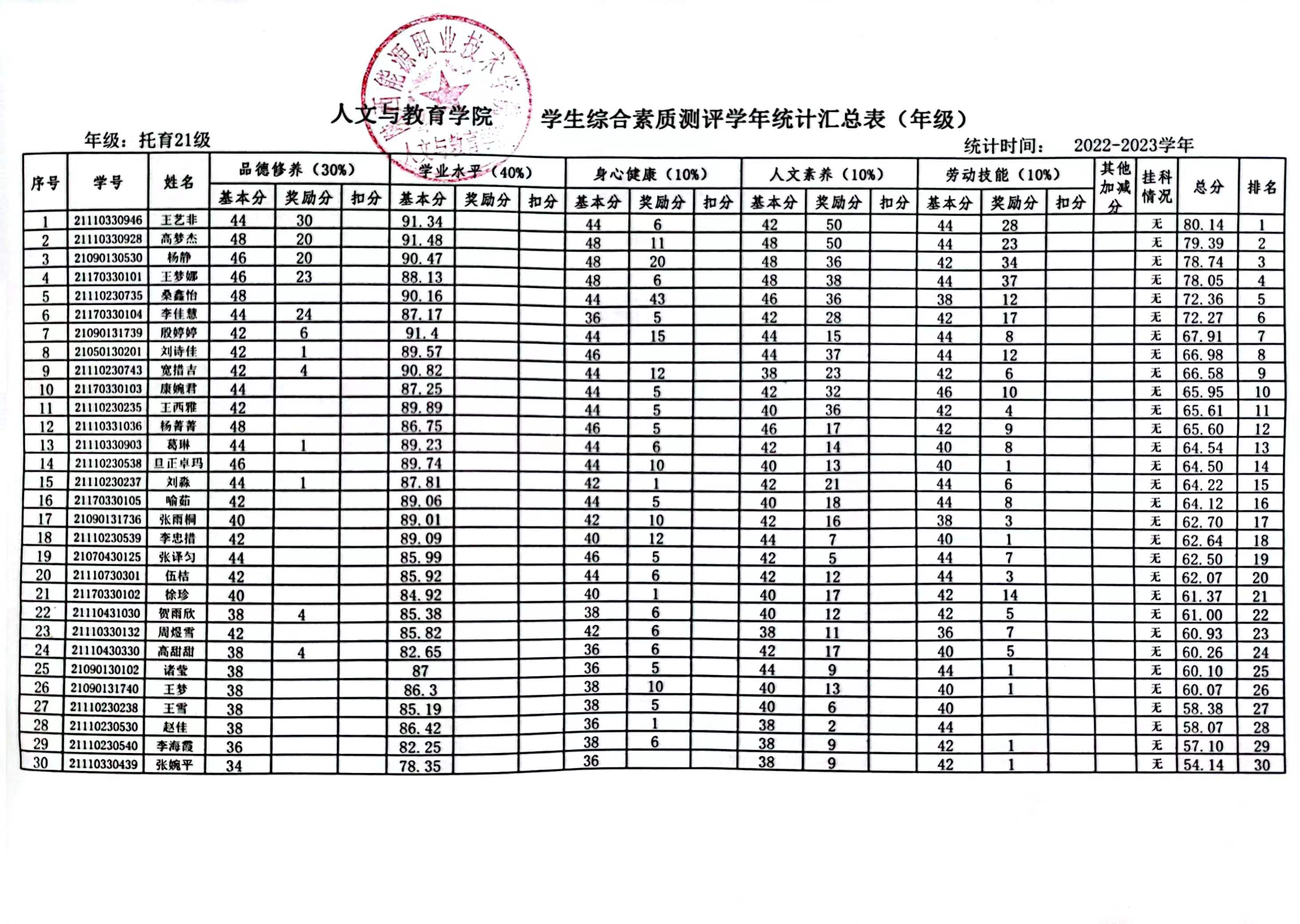 按照《陕西能源职业技术学院学生综合素质测评实施办法(修订)》(陕能院学〔2021〕36号)及学工部《关于做好2022-2023 学年学生综合素质测评总评及年度评优工作的通知》要求,人文与教育学院严格执行文件,认真总结、整理、核算学生综合素质各模块总成绩,经过材料提交、班级鉴定公示及学院审核,现将人文与教育学院学院2022-2023学年学生综合素质测评结果公示如下。