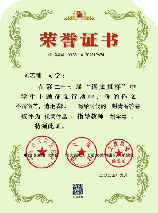 近日,第二十七届“语文报杯”中学生主题征文行动评选结果揭晓。人文教育学院五年制学生刘若铺同学凭借作品《不蕴微芒,造炬成阳——写给时代的一封青春答卷》,在全国征文中脱颖而出,荣获优秀作品奖。该作品语言流畅、立意深刻,展现了新时代学生的思考深度与责任担当。