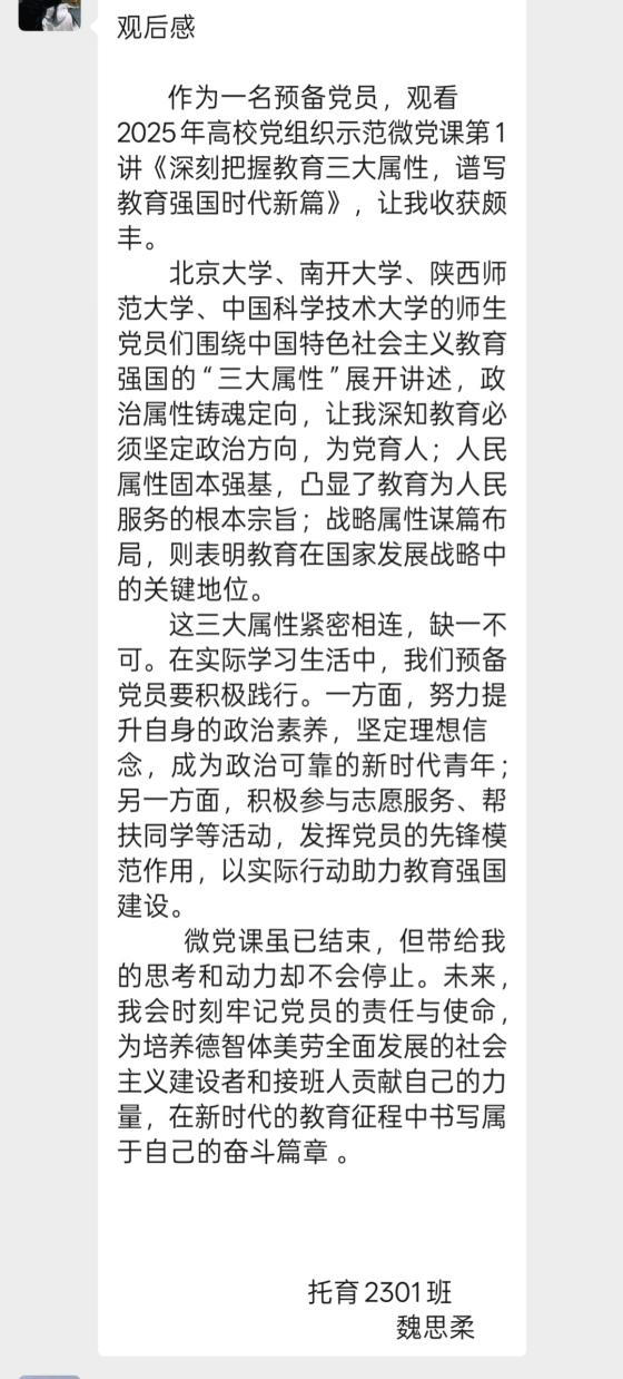 观看过程中,同学们全神贯注,认真记录。活动结束后,大家纷纷表示,本次学习不仅深化了对教育强国战略的理解,更激发了投身教育事业的热情与责任感。预备党员魏思柔同学表示:“微党课虽已结束,但带给我的思考和动力却不会停止。未来,我会时刻牢记党员的责任与使命,在新时代的教育征程中书写属于自己的奋斗篇章 。”