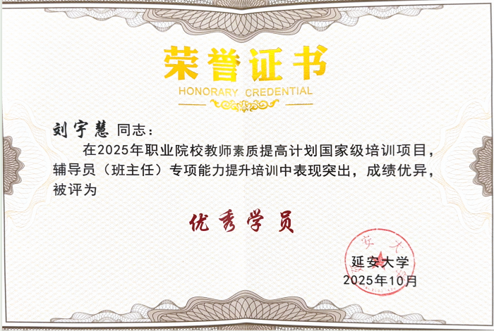 近日,在2025年职业院校教师素质提高计划国家级培训项目——辅导员(班主任)专项能力提升培训中,陕西能源职业技术学院人文教育学院教师刘宇慧同志表现突出、成绩优异,被延安大学评为“优秀学员”荣誉称号。
