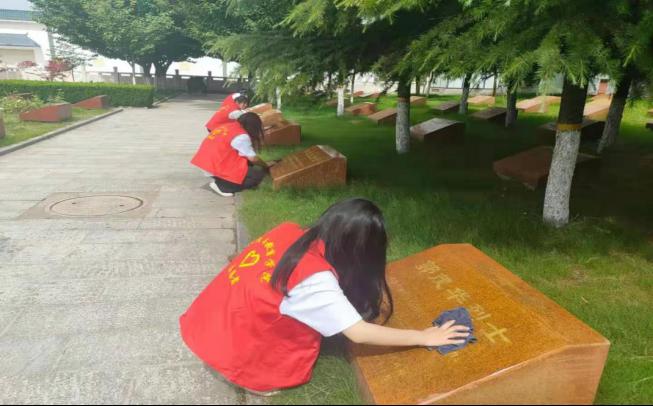 大家怀着崇敬的心情瞻仰烈士墓碑,开展了檫拭烈士墓碑的活动,通过这一活动,同学们的心灵得到了洗涤。