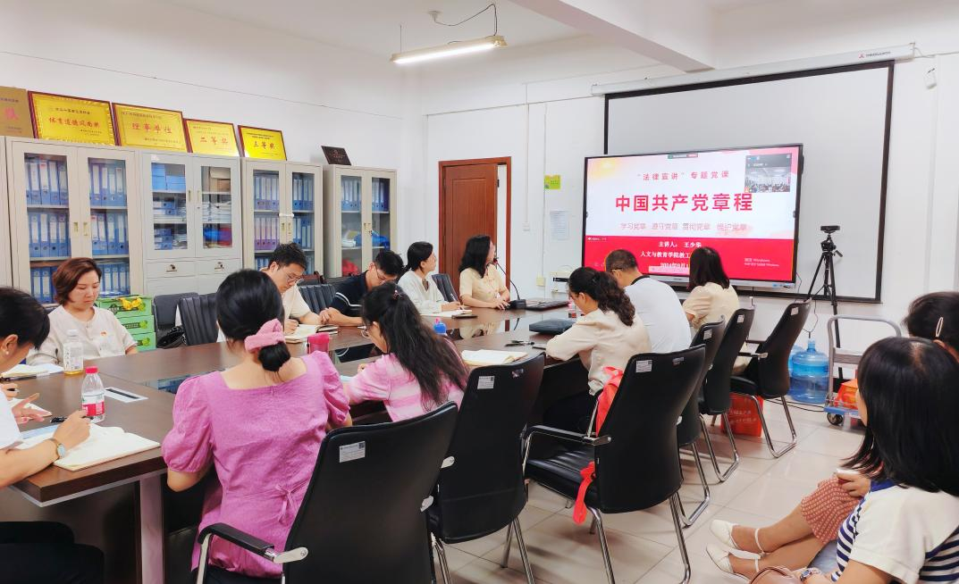 为进一步提升党员的党性修养和纪律意识,引领支部党员深入学习习近平法治思想,遵规守纪,潜心治学,9月11日下午,人文与教育学院教工党支部在学院会议室,开展了以“学习党章、遵守党章、贯彻党章、维护党章”为主题的学习《中国共产党章程》专题党课活动。全体支部党员和预备党员参加,支部书记王少华主讲。