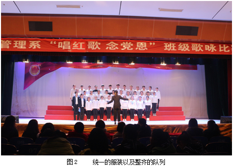 本次比赛全系一二年级共十四个队参加, 一曲《国家》拉开了比赛的序幕,尔后,《东方红》、《走进新时代》、《团结就是力量》、《歌唱祖国》等一支支红色经典歌曲,被同学们激情演唱。比赛中,各班服装统一,阵容整齐,歌声洪亮,感情真挚。
