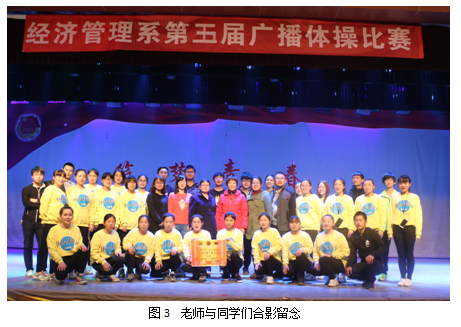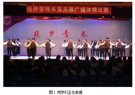 为了增强我系学生体质,活跃学生课余生活,经济管理系于2016年11月初进行安排布置,各新生班级的同学在班主任的带领下,利用课余时间认真练习,于2016年11月15日晚20点在菊园四楼举行了系新生广播体操比赛。参加这次比赛的老师有:经济管理系书记李鲜玲、学工办主任高亚娟、辅导员老师蒋文、赵飞、田冲老师2016级新生班主任以及全体新生。