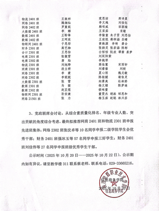 2024-2025学年信息商务学院三好学生、优秀学生干部、先进班集体拟推荐公示