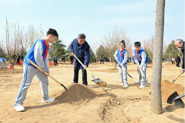 在京中共中央政治局委员、中央书记处书记、国务委员等参加植树活动。