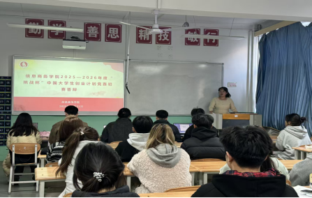 2025年11月21日,信息商务学院在教学楼314举办2026年度“挑战杯”初赛。本次赛项共收到14个参赛队伍的项目计划书,涵盖文化创意和区域交流合作、科技创新和未来产业、乡村振兴和农业农村现代化、社会治理与公共服务、生态文明建设和绿色低碳发展五大类别。