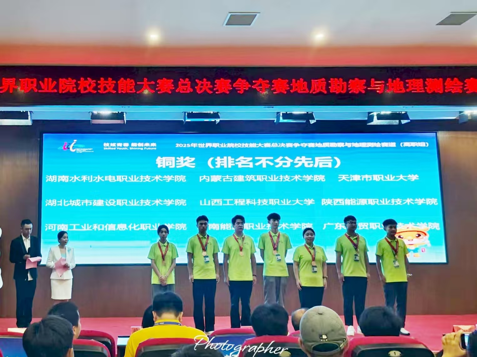 8月25日至30日,2025年世界职业院校技能大赛总决赛争夺赛地质勘察与地理测绘赛道(高职组)在江西应用技术职业学院隆重举行。经过激烈角逐,由我校建筑测绘学院教师崔团团、唐凝指导,无人机2301班赵静、测量2301班赵力、无人机2401班刘雄、测量2401班王月明四位同学组成的师生代表队凭借出色表现,最终荣获大赛铜奖,展现了我校师生精湛的专业技能和良好的精神风貌。