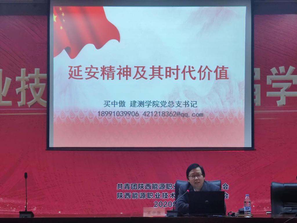 12月9日下午,建测学院党总支书记买中傲在实训楼6楼报告厅以“延安精神及其时代价值”为题,给全体2020级、2019级同学讲授了一堂精彩的思政课,鼓励广大学子要扛起新时代青年的使命担当,结合自身实际积极学习和弘扬延安精神,用青春谱写奋斗之歌。