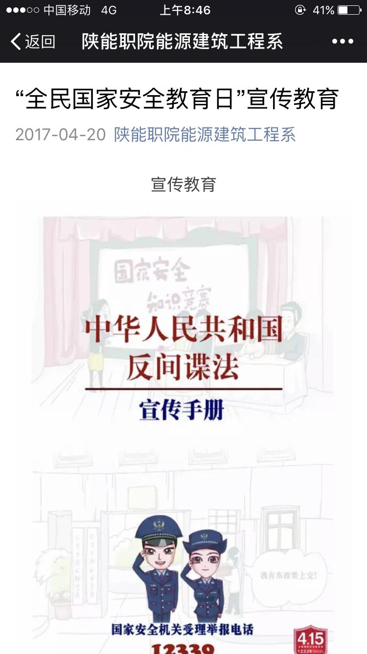 我院组织开展“国家安全教育”主题活动。活动内容丰富,各班级组织召开“国家安全教育”主题班会、观看“反奸防谍,反恐怖防渗透”主题宣传片,并在系部微信公众号在近期发布“国家安全教育”相关主题推送信息,通过学生喜闻乐见的形式,大力宣传国家安全知识增强同学们相关法律意识。