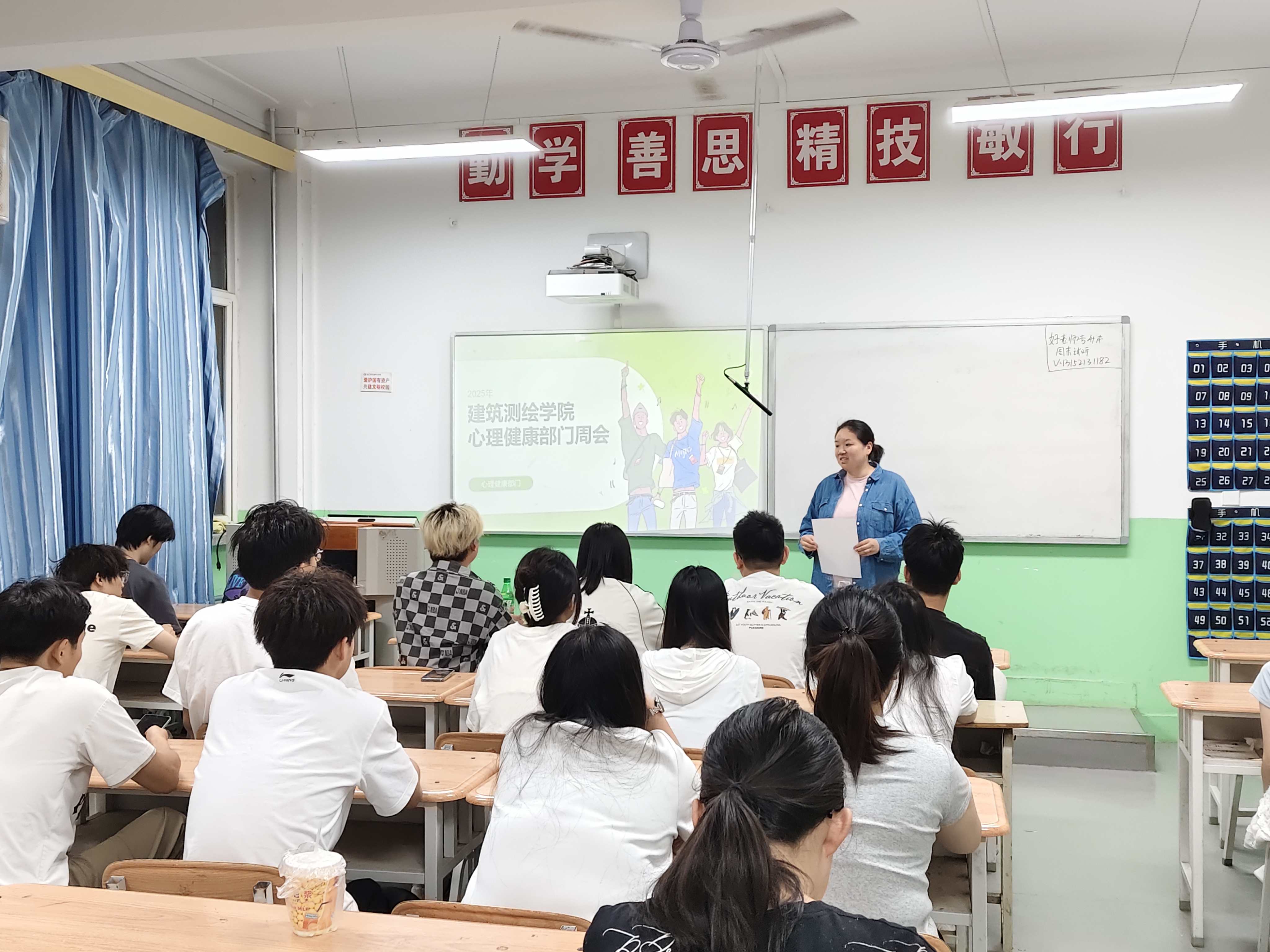 2025年5月7日晚自习建筑测绘学院心理健康部门在教学楼102教室组织开展每周例会,主要参会人员有心理辅导员李雪洁老师,心理健康部门部长、干事及各班心理委员,例会主要分为以下三部分内容: