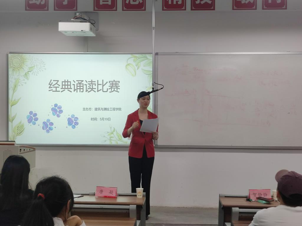 为增强广大学生的爱国情怀,提高学生文化自信,建筑与测绘工程学院于5月19日晚在教学楼116举办了国学经典朗诵比赛。此次比赛共有来自建测学院20、21级的16位参赛选手,邀请了唐凝、袁茵以及贺静静老师三位老师作为评委。此外,建测学院党总支书记买中傲、全体建测辅导员共同参加了此次活动。