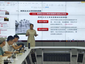 本次集体备课会李春霞围绕教材第二章“新民主主义革命理论”的内容展开。首先,她从本讲课程的教学导入谈起,并阐述了教学方法、教学重难点、教学过程。她讲到,通过问题式导入,引发学生思考。在教学过程中要深入了解学生学情和专业特性,结合行业案例和校本特色,激发学生学习的积极性、主动性。此外,在教学中通过“课堂讨论”、“情境体验(虚拟仿真实验体验)”、“重点解析”等模块,在充分运用现代化信息教学手段的基础上,发挥学生主体地位,实现以学生为中心的教学理念。