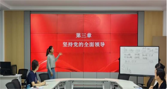 此次集体备课主要围绕“习近平新时代中国特色社会主义思想概论”课程第三章“坚持党的全面领导”展开。在“中国共产党领导是中国特色社会主义最本质的特征”部分,李春霞以《十封入党申请书》视频为切入点,通过习近平总书记的入党故事,引导学生回答问题:习近平总书记为什么要坚定地加入中国共产党?作为新时代青年,说说你心中的中国共产党?使学生体会到中国特色社会主义最本质的特征是中国共产党领导,中国特色社会主义制度的最大优势是中国共产党领导。在“坚持党对一切工作的领导”部分,运用图片展示的方式,讲述国旗的设计理念,使学生理解中国共产党是全中国人民的领导核心。在“健全和完善党的领导制度体系”部分, 选用习近平总书记考察陕西榆林杨家沟革命旧址的案例,讲述党的领导是“定海神针”,坚持党的全面领导,必须依靠制度来保障,让党的领导真正落到实处。
