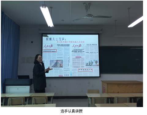 比赛结束,董老师综合各位评委的意见对每位选手的讲授情况作了点评。董老师先充分肯定了各位选手的共同优点:大家准备都很充分、很认真,语言流畅,讲授熟练,仪态大方,精神饱满等。然后就每位选手各自讲授存在的问题也告知大家。希望大家继续发扬各自的长处,改进不足,并以此为契机,在以后的教学过程中不断提升自己,促进教学质量不断提高。