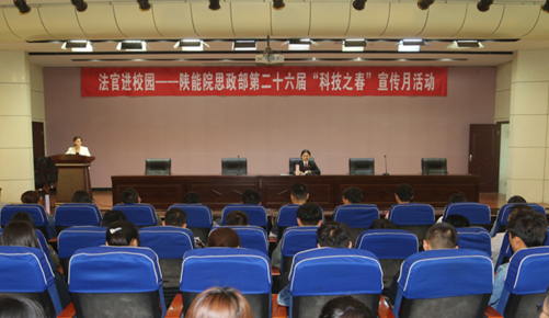 为进一步提升我校学生的法治思维水平、树立法治信仰,维护法律权威、养成学法、懂法、依法办事、依法维权的良好习惯,根据陕西省科学技术协会《关于开展陕西省第二十六届“科技之春”宣传月活动的通知》(陕科协发[2018] 1号)、陕西省教育厅《关于组织开展第二十六届“科技之春”宣传月活动的通知》及我校第二十六届“科技之春”宣传月活动要求,4月11日下午,思政部邀请咸阳市渭城区人民法院民事审判庭二庭审判员李君涵法官在实训楼六楼报告厅为我校学生做了关于《劳动合同法》相关内容的法律知识讲座。咸阳市渭城区人民法院民事审判庭二庭庭长沙咸云、思政部全体教师、学工部、辅导员及学生代表约360人参加了此次活动。讲座由思政部教师刘苗主持。
