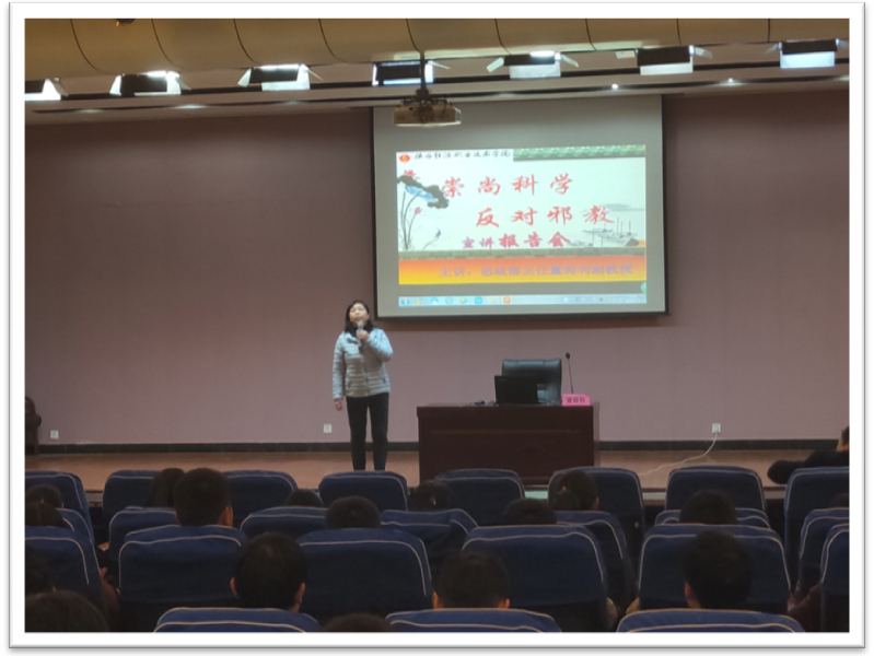 2018年12月3日晚,思政部在培训楼六楼报告厅举行了“崇尚科学、反对邪教”宣讲报告会。报告会由思政部主任董莉利老师主讲,基础课教学部的思政老师、辅导员及全体学生参加了报告会。