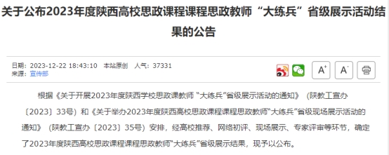 12月下旬,由中共陕西省委教育工委、陕西省教育厅组织的2023年度陕西高校思政课教师“大练兵”现场展示活动在西北工业大学举行。我校马克思主义学院种永恒、李春霞两位老师分别荣获“思政课教学能手”荣誉称号。