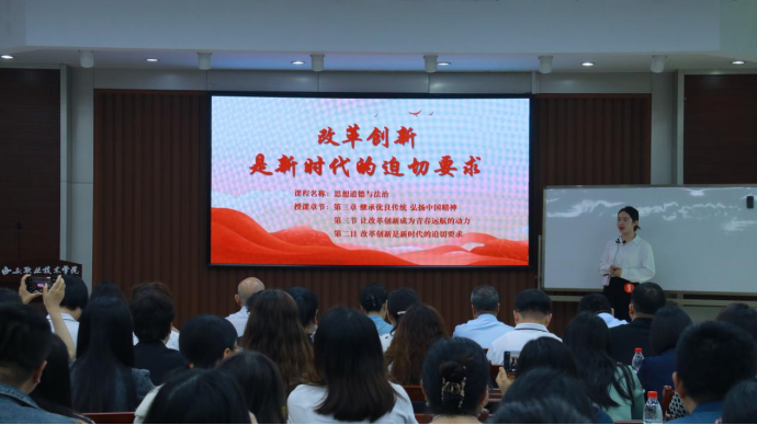 4月27日,由陕西省高职高专思想政治理论课教学研究会主办的陕西省高职高专2024年“秦马磨课会”“思想道德与法治”课程教学展示活动在西安职业技术学院主校区举行,来自全省高职院校的马克思主义学院院长、教研室主任及参赛教师共计100余人参加了此次活动。我校马克思主义学院副院长高慧、思政课教师苏妮、杨淑妮、仲文强、杨静参加现场活动。