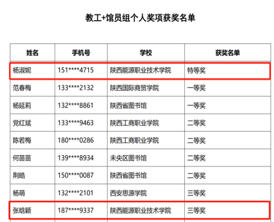 在此次竞赛活动中,全省99所高校2万余名教师和学生读者参赛,经过激烈角逐,我院青年教师杨淑妮获“教工+馆员组”特等奖,张晗颖获“教工+馆员组”三等奖。