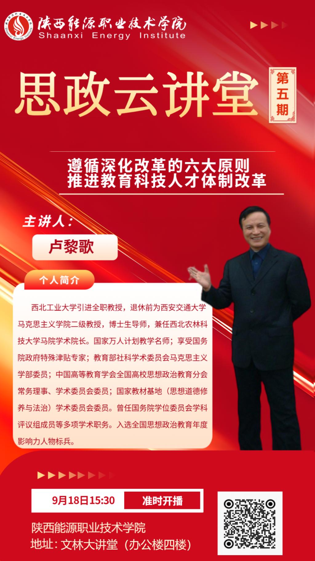 为学习贯彻党的二十大精神,落实习近平总书记关于“大思政课”的重要指示批示精神,坚持不懈用习近平新时代中国特色社会主义思想铸魂育人,马克思主义学院联合校团委拟于2024年9月18日下午3点30分在办公楼4楼文林大讲堂举办“思政云讲堂”第五期活动。此次活动特邀西安交通大学马克思主义学院卢黎歌教授作题为“遵循深化改革的六大原则 推进教育科技人才体制改革”的专题讲座,欢迎感兴趣的老师、同学们前来参会。